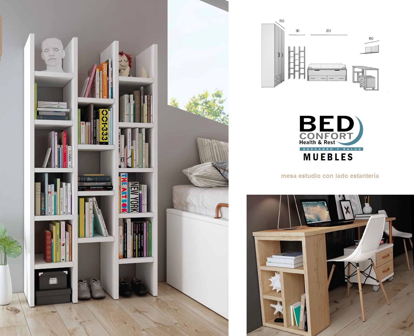 Dormitorio con armario de 3 puertas y dos cajones,módulo estanterias doble cama con cajones, y mesa estudio.