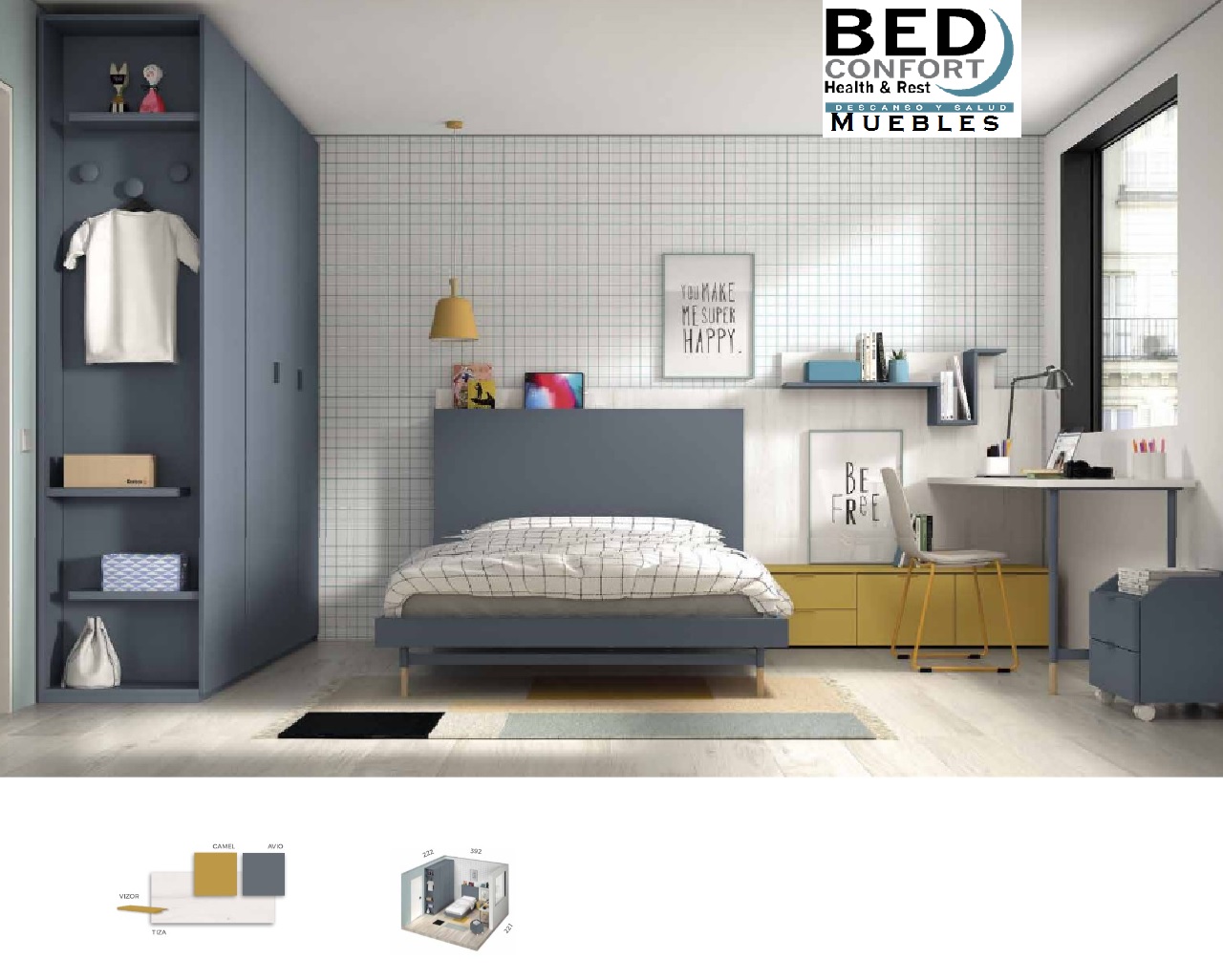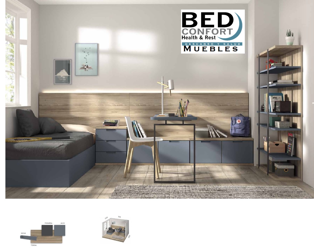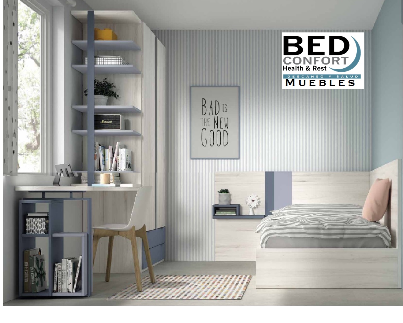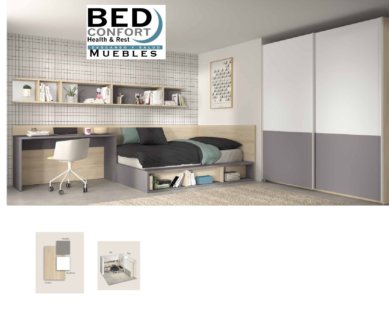 Dormitorio juvenil con una cama,mesa estudio, estanterias y armario puertas correderas.