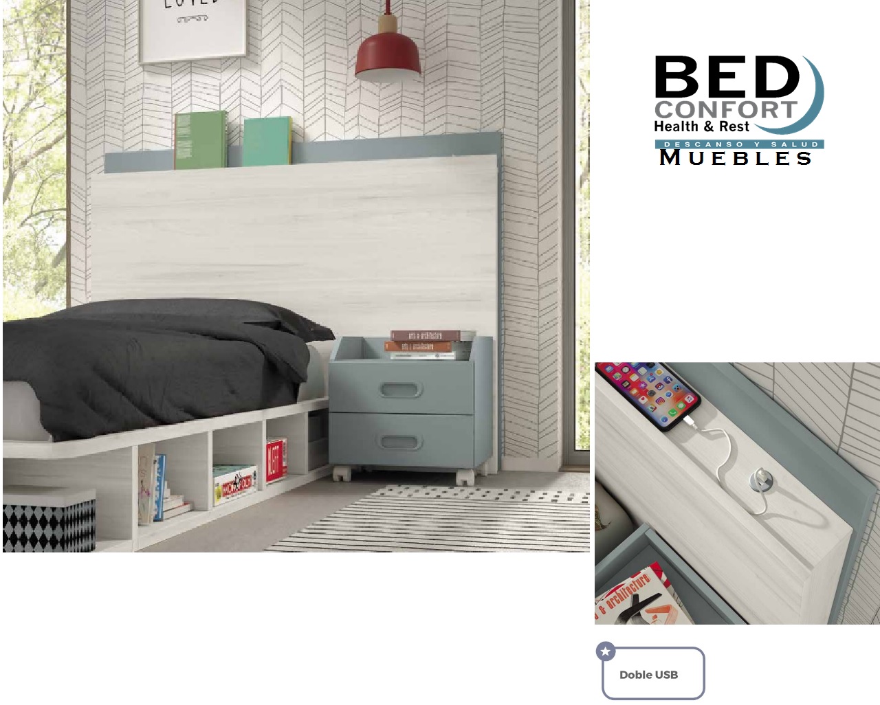Dormitorio cama con cajones,armario 3 puertas y mesa de estudio con estante.