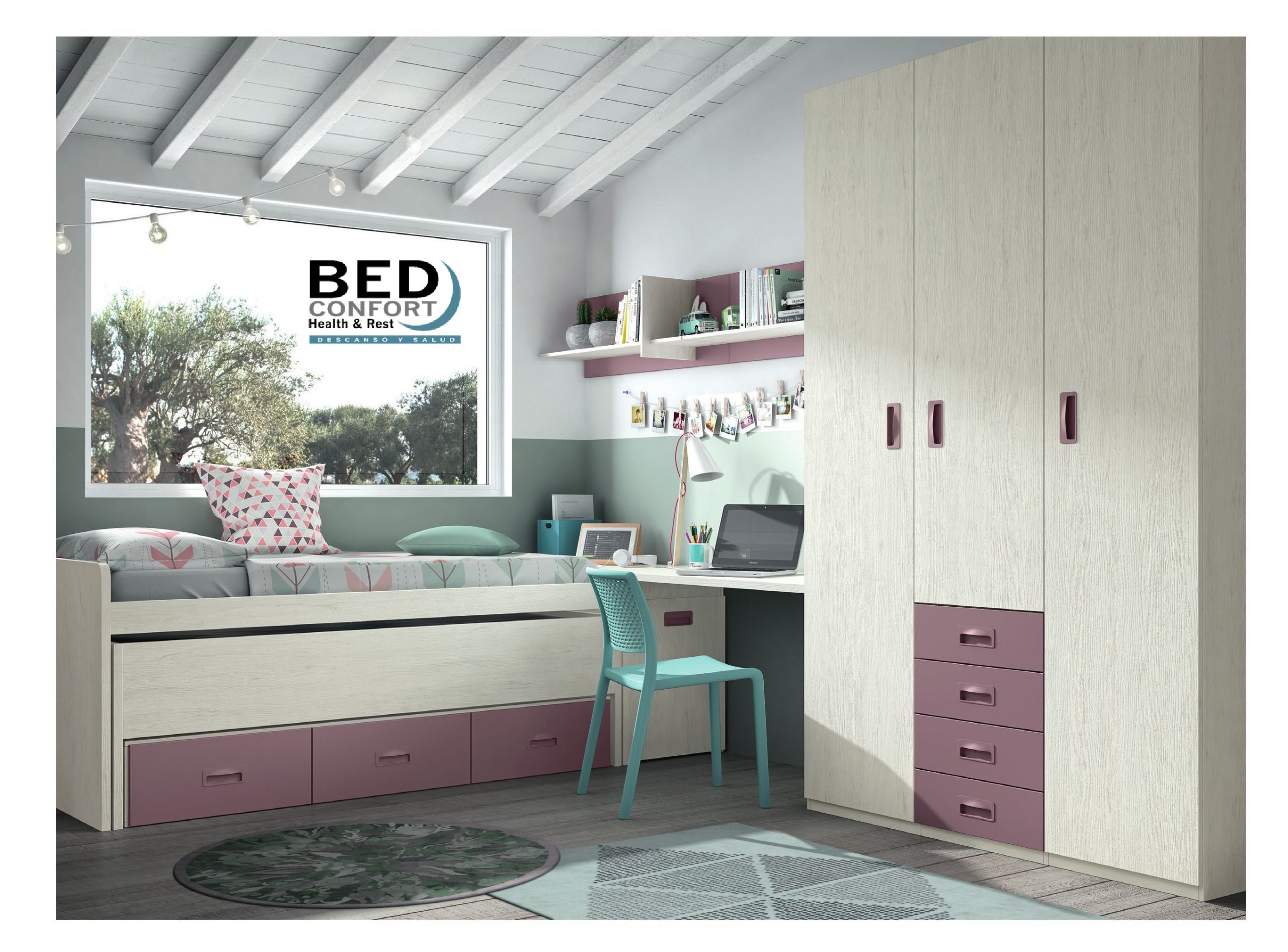 Dormitorio juvenil con dos camas 90 x 190, bajo 3 cajones, con arcón zapatero, mesa de esstudio y armario de 3 puertas,cuatro cajones.
