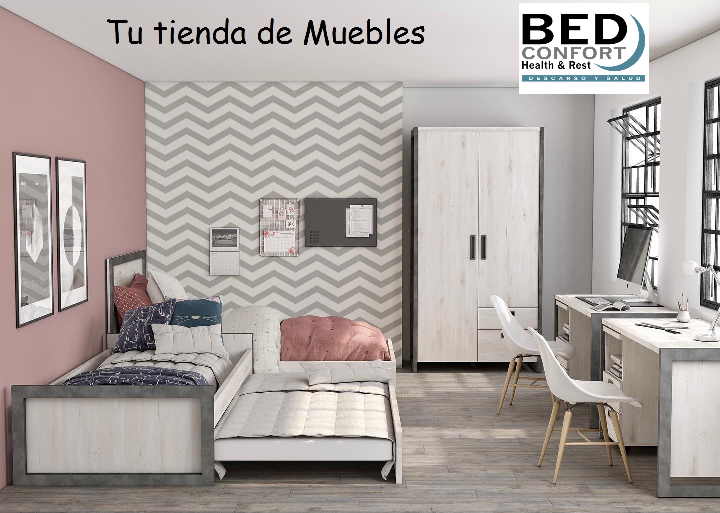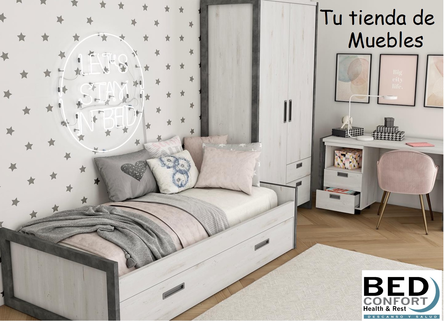 Dormitorio con dos camas 90 x 190 y armario de 2 puertas 2 cajones y mesa de estudio con bajo dos cajones y hueco.