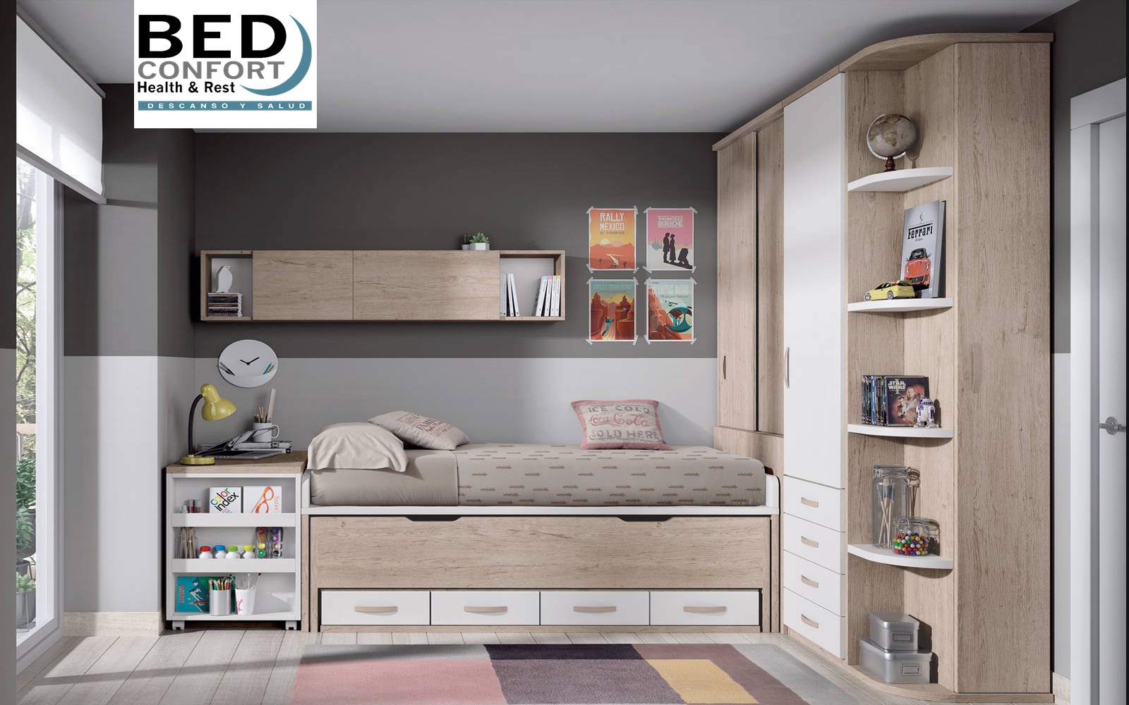 Dormitorio Juvenil con dos camas de 90,bajo cajones pequeños.