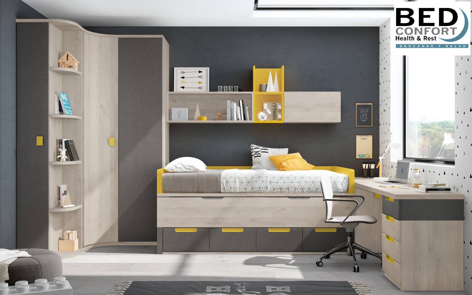 Dormitorio juvenil con dos camas 90,bajo 4 cajones.