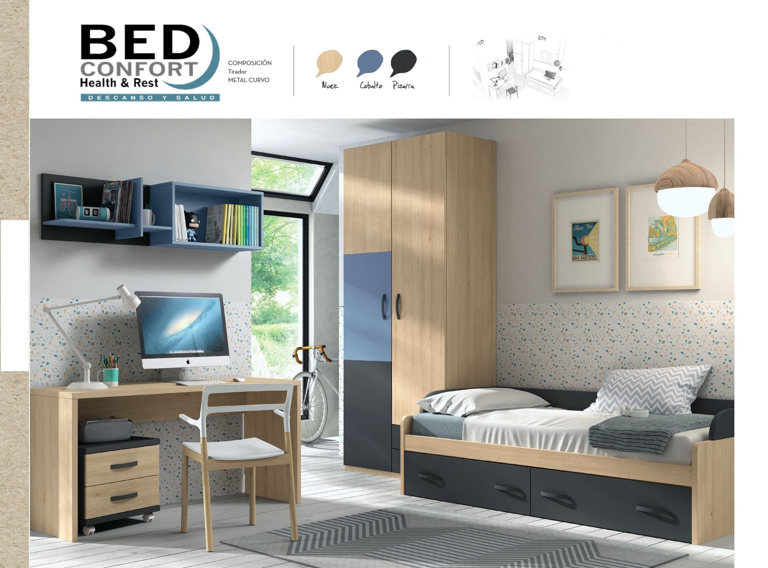 Dormitorio juvenil con cama d 90 x 190, y bajo 2 cajones.