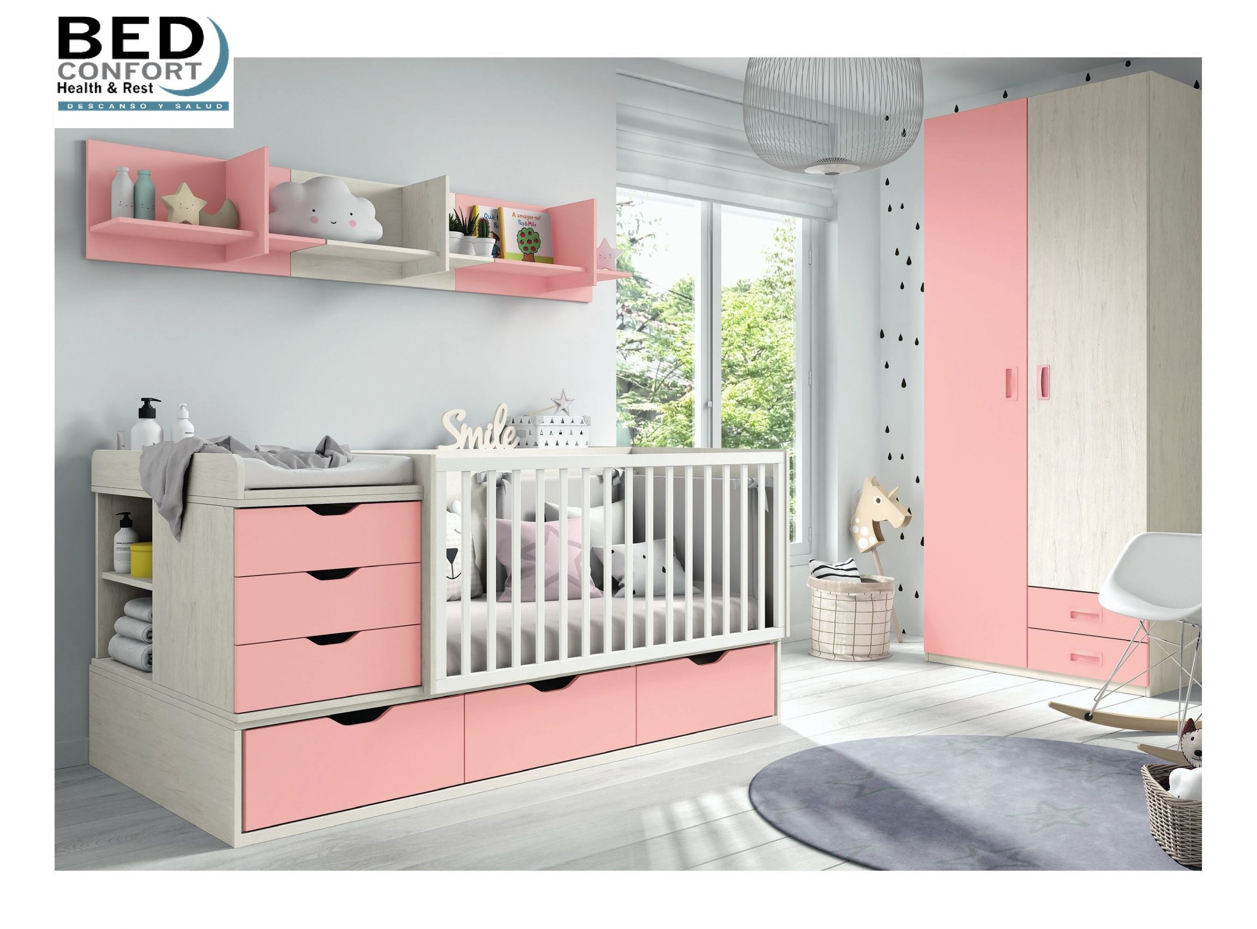 Cama cuna convertible y adaptable,bajo 3 cajones,con colchoneta cambiador, con estantes.