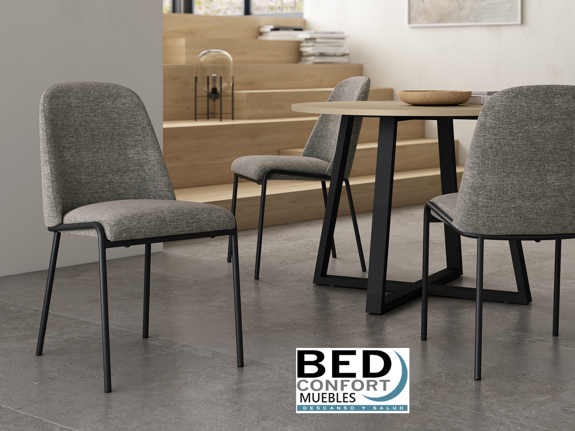 Silla con rspaldo y asiento tapizado,patas metálicas negras.
