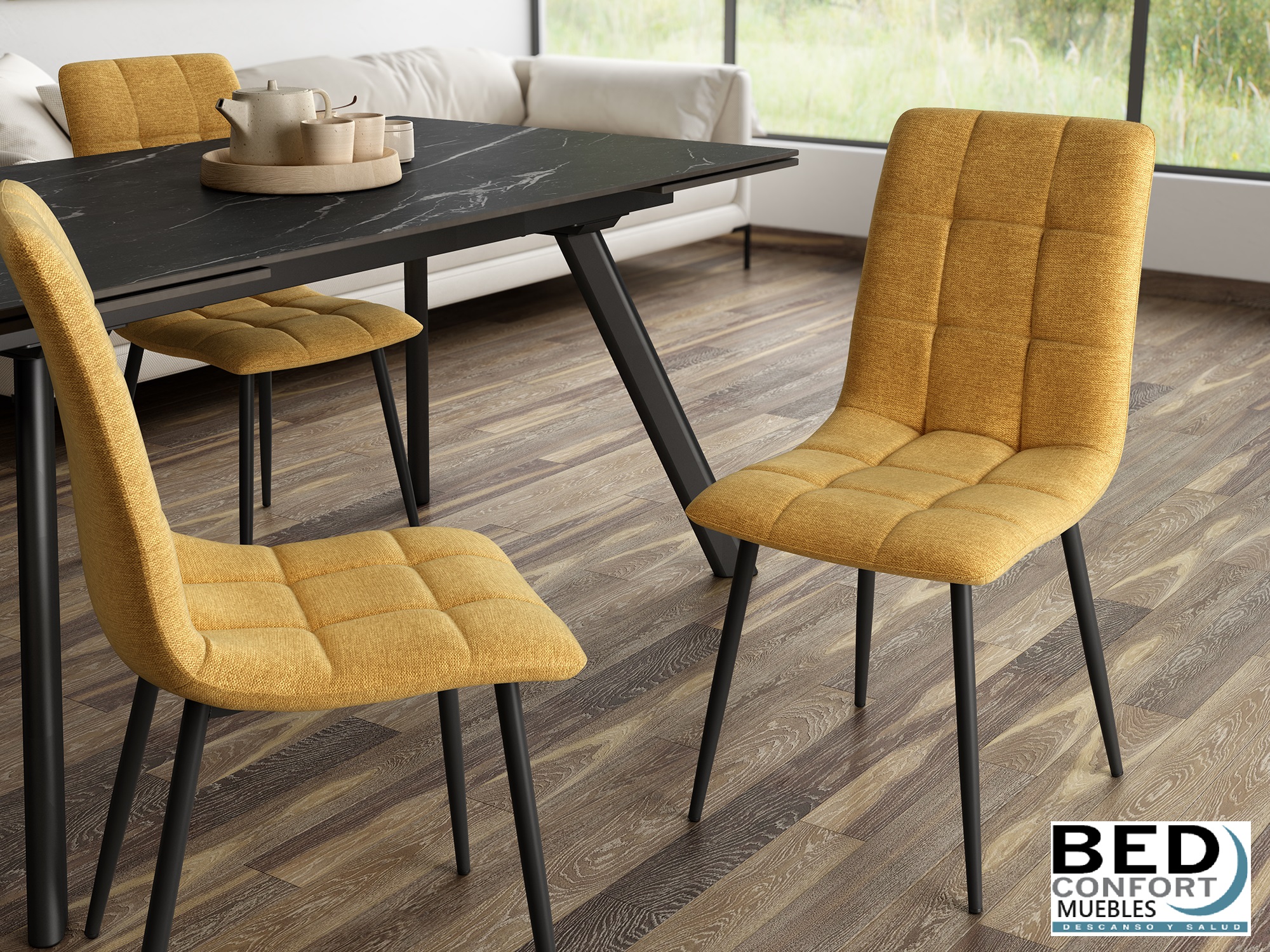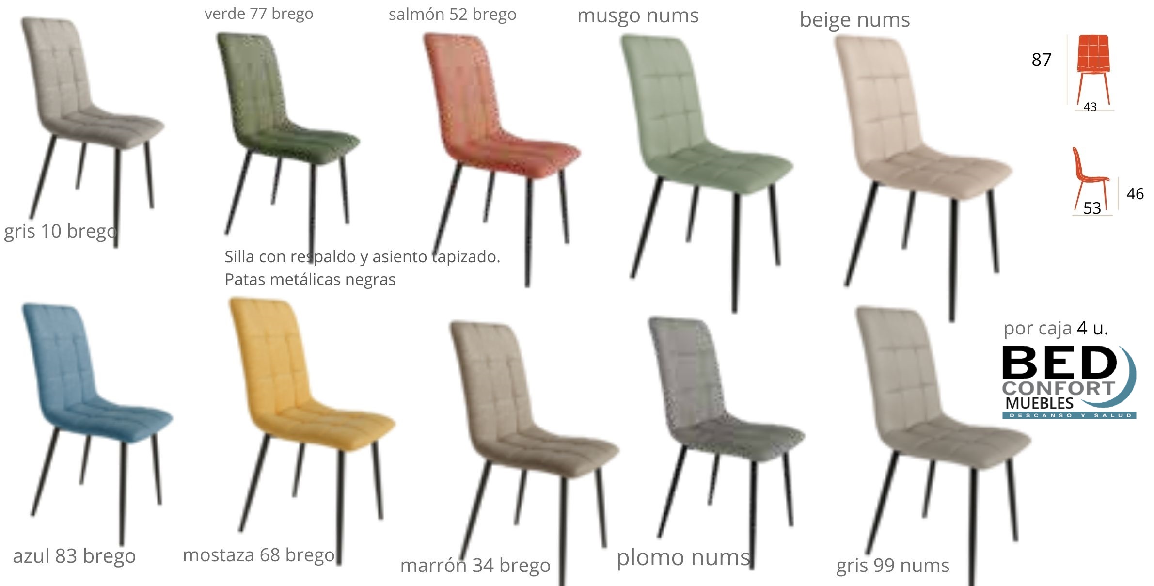 Silla con asiento y respaldo tapizado,patas metálicas negras.