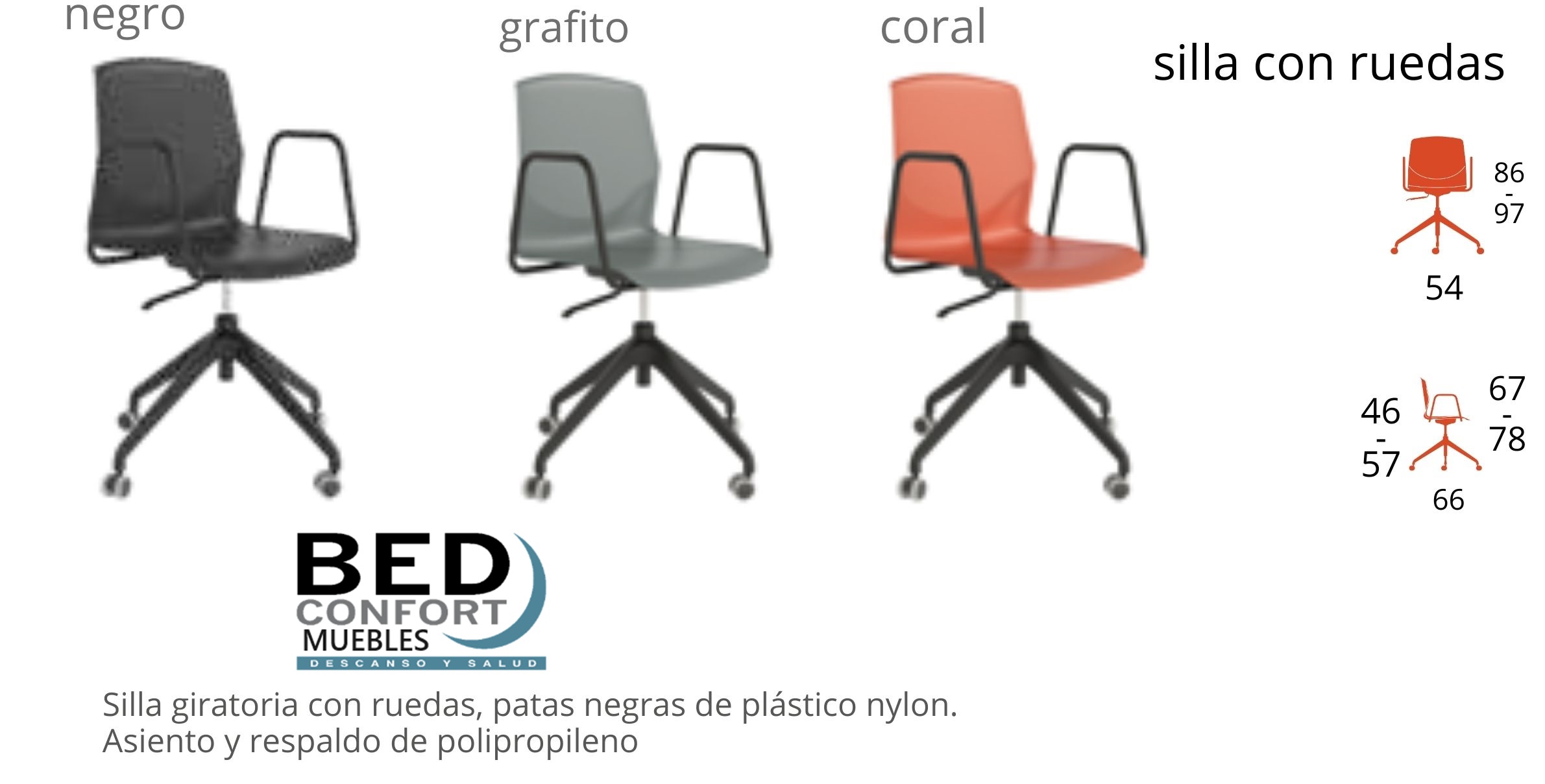 Silla giratoria con ruedas,patas negras de plástico nylon,asiento y respaldo de polipropileno.